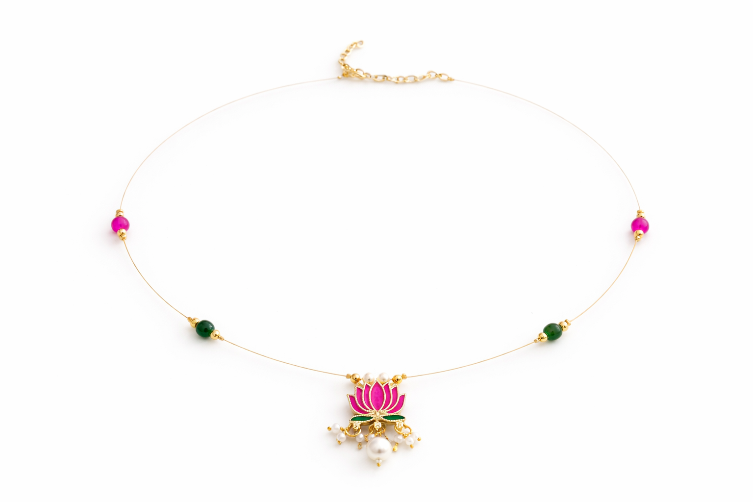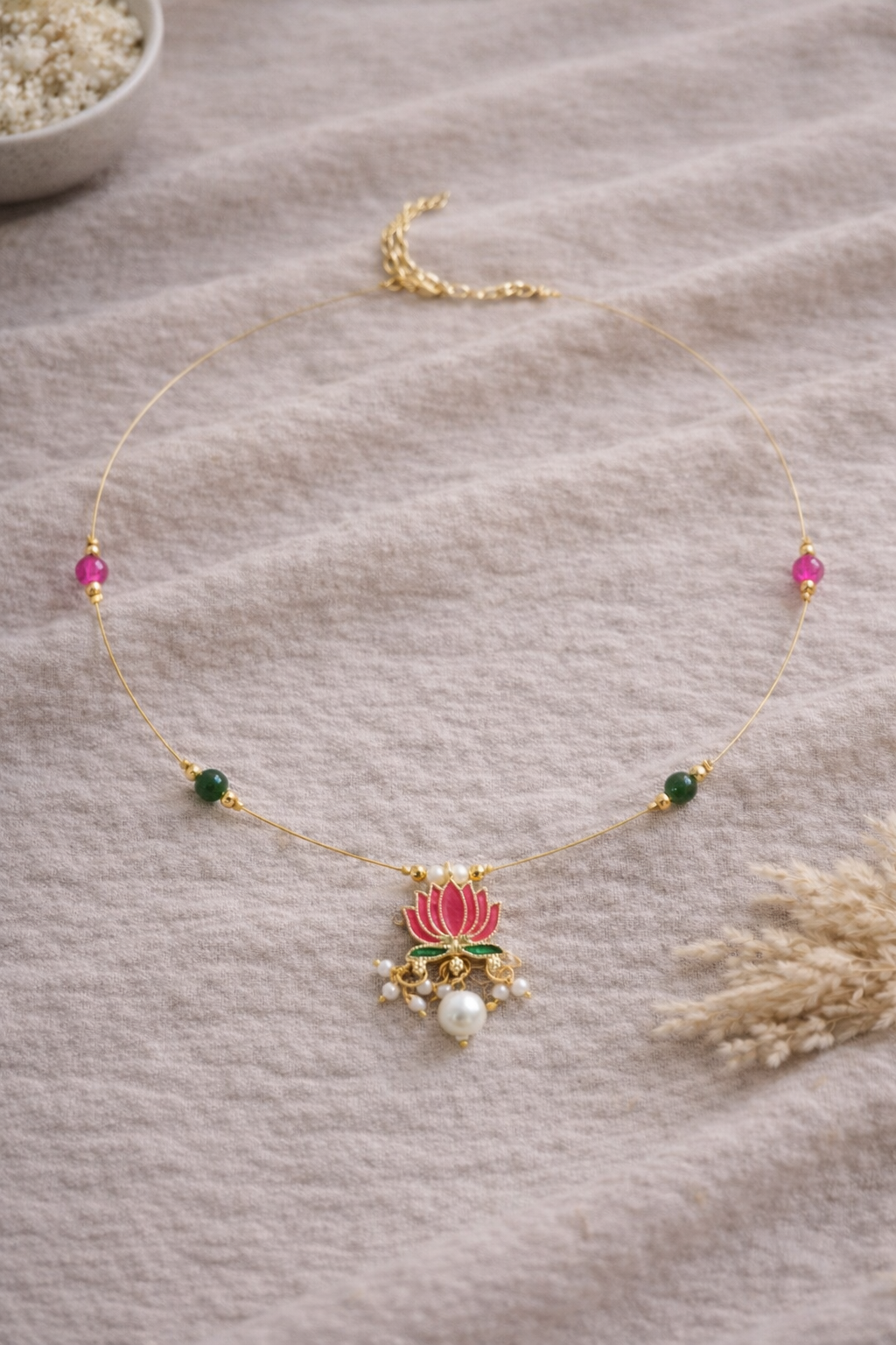 At the center lies a finely detailed lotus motif in pink and green enamel, symbolizing purity and grace. The pendant is finished with soft pearl drops and complemented by green and pink accent beads placed along the wire for a balanced, delicate look. A gold-toned adjustable clasp ensures comfort and versatility.