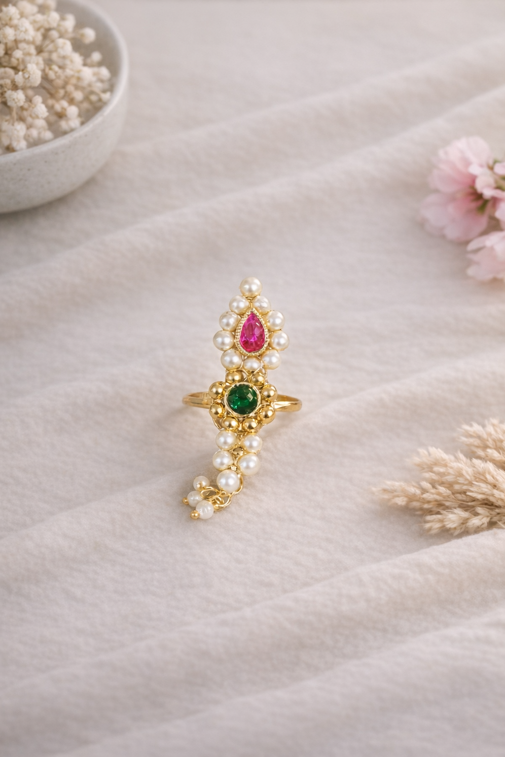 This elegant Nath Finger Ring is a beautiful fusion of tradition and modern styling. Crafted with a gold-tone base, the design features lustrous pearls arranged gracefully around vibrant pink and green stones, inspired by classic Maharashtrian and temple jewellery aesthetics.