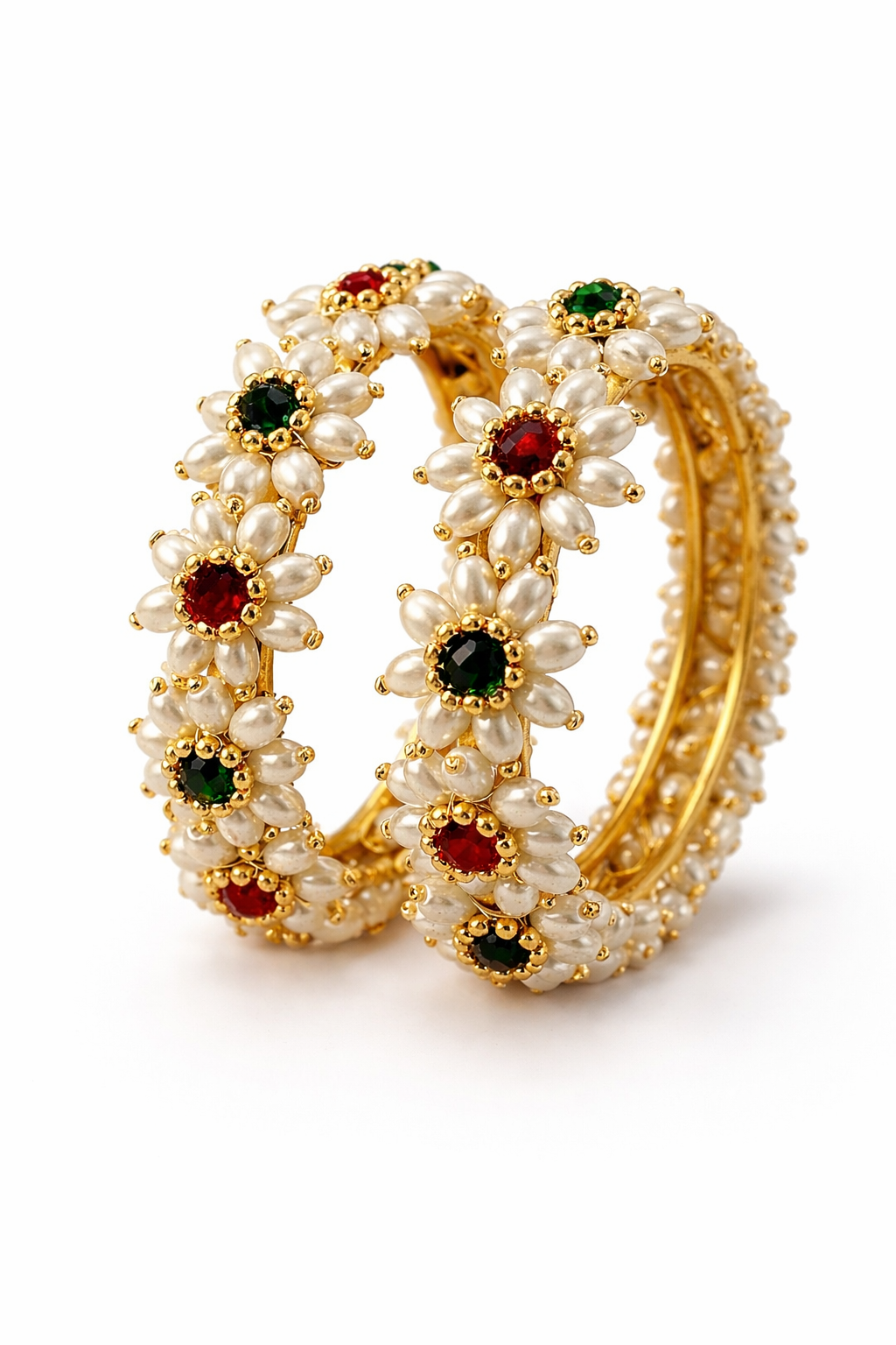 Inspired by the timeless beauty of the Parijatak flower, these Parijatak Bangles – Green & Red celebrate classic craftsmanship with a graceful, feminine touch. Handcrafted using lustrous pearl petals and highlighted with deep green and ruby-red stones, each floral motif blooms softly against a warm gold-tone base.