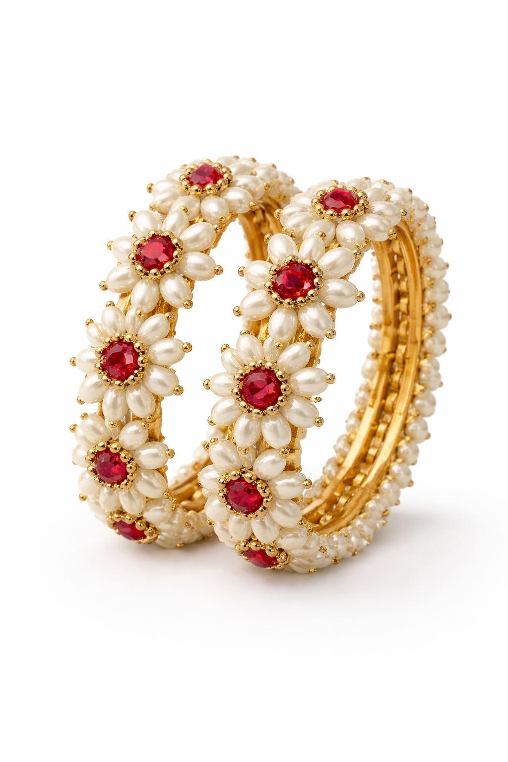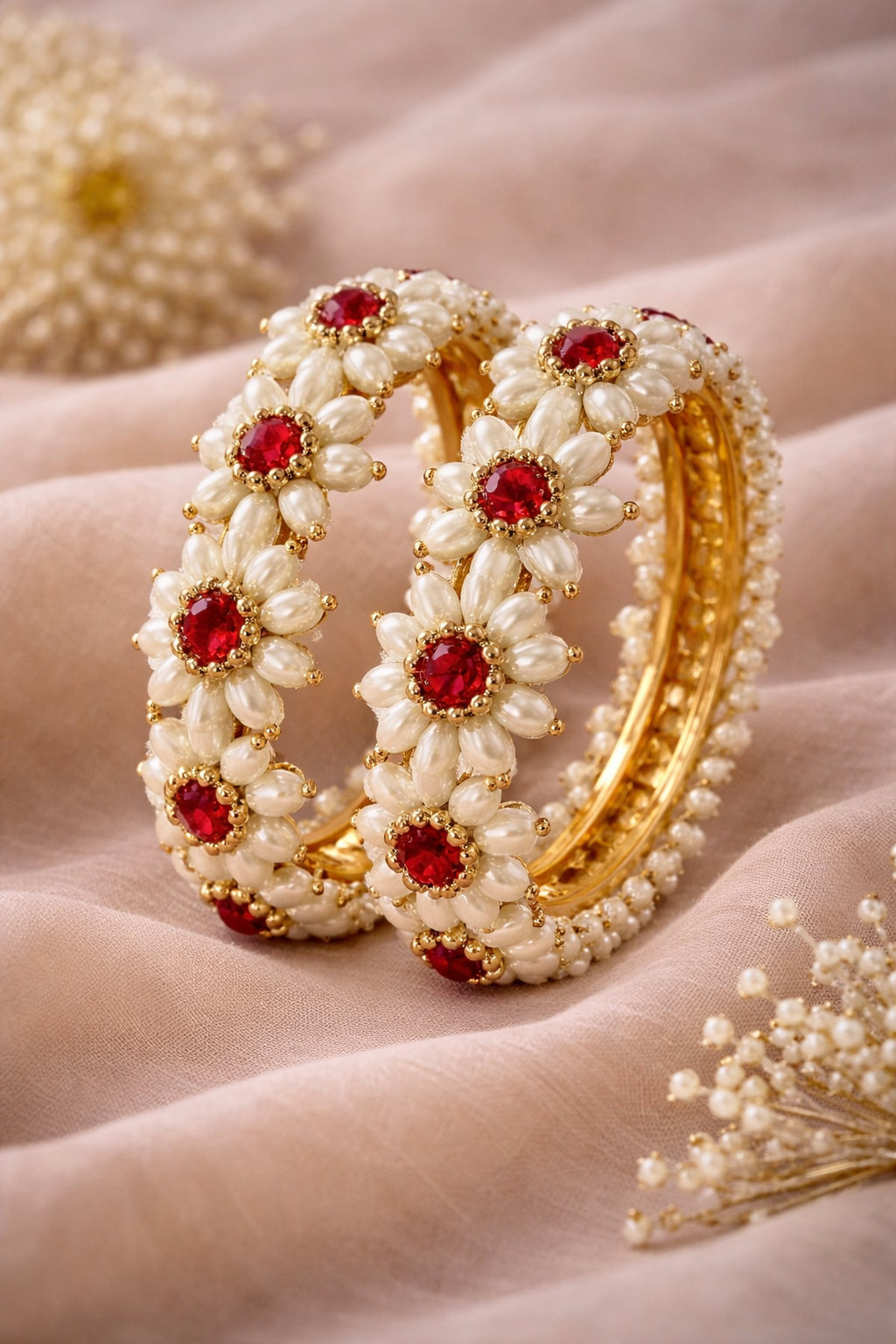 Set on a warm gold-tone base, these bangles strike the perfect balance between heritage and refinement. The luminous pearls soften the bold red accents, creating a design that feels regal yet wearable. Carefully handcrafted and lightweight, they are ideal for weddings, festive occasions, and traditional celebrations.