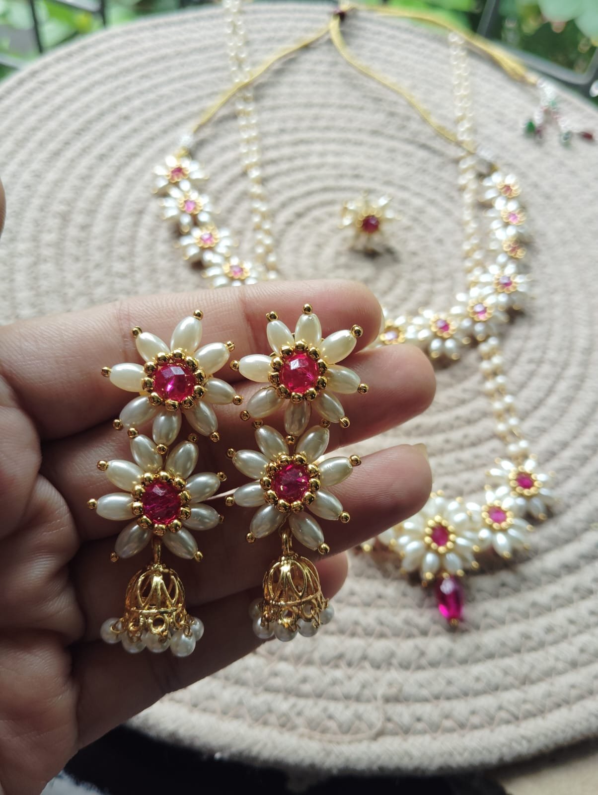 The Parijatak Saaj – Pink is a delicately handcrafted traditional jewelry set inspired by floral elegance. Featuring hand-set pearl petals arranged in blooming floral motifs, this set is highlighted with vibrant pink stone centers and finished with layered pearl strands for a graceful silhouette. The necklace is paired with matching floral jhumka earrings that echo the same intricate detailing.