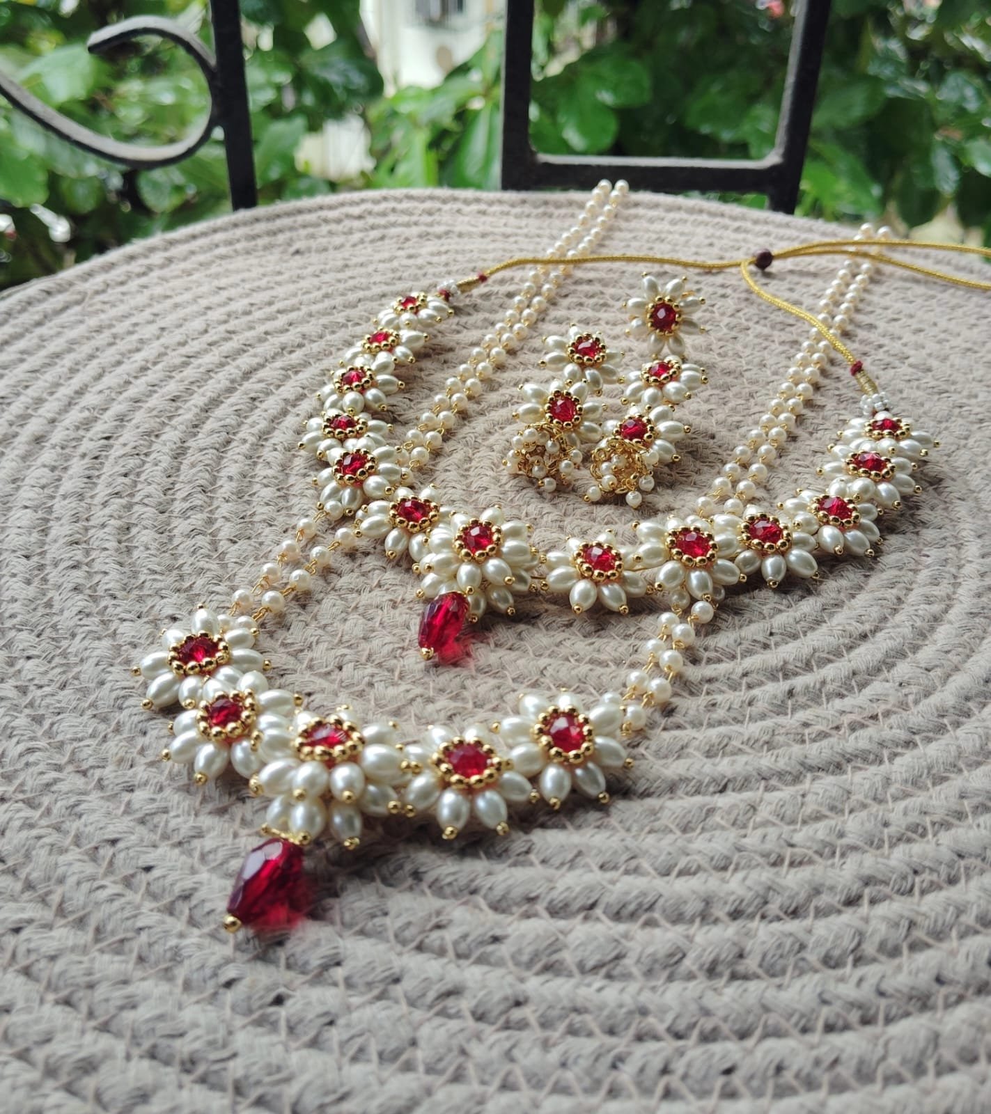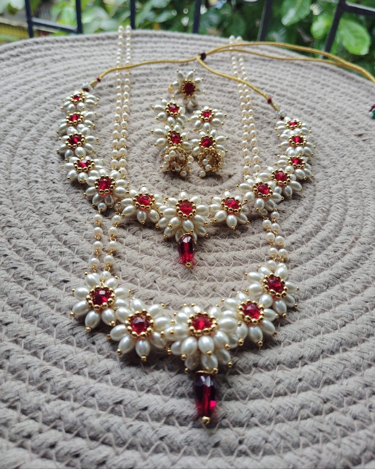 The necklace features layered pearl strands that create a graceful drape, finished with a striking red teardrop pendant for added drama. Paired with matching floral jhumka earrings, this set is designed to elevate bridal looks, festive ensembles, and cultural attire.
