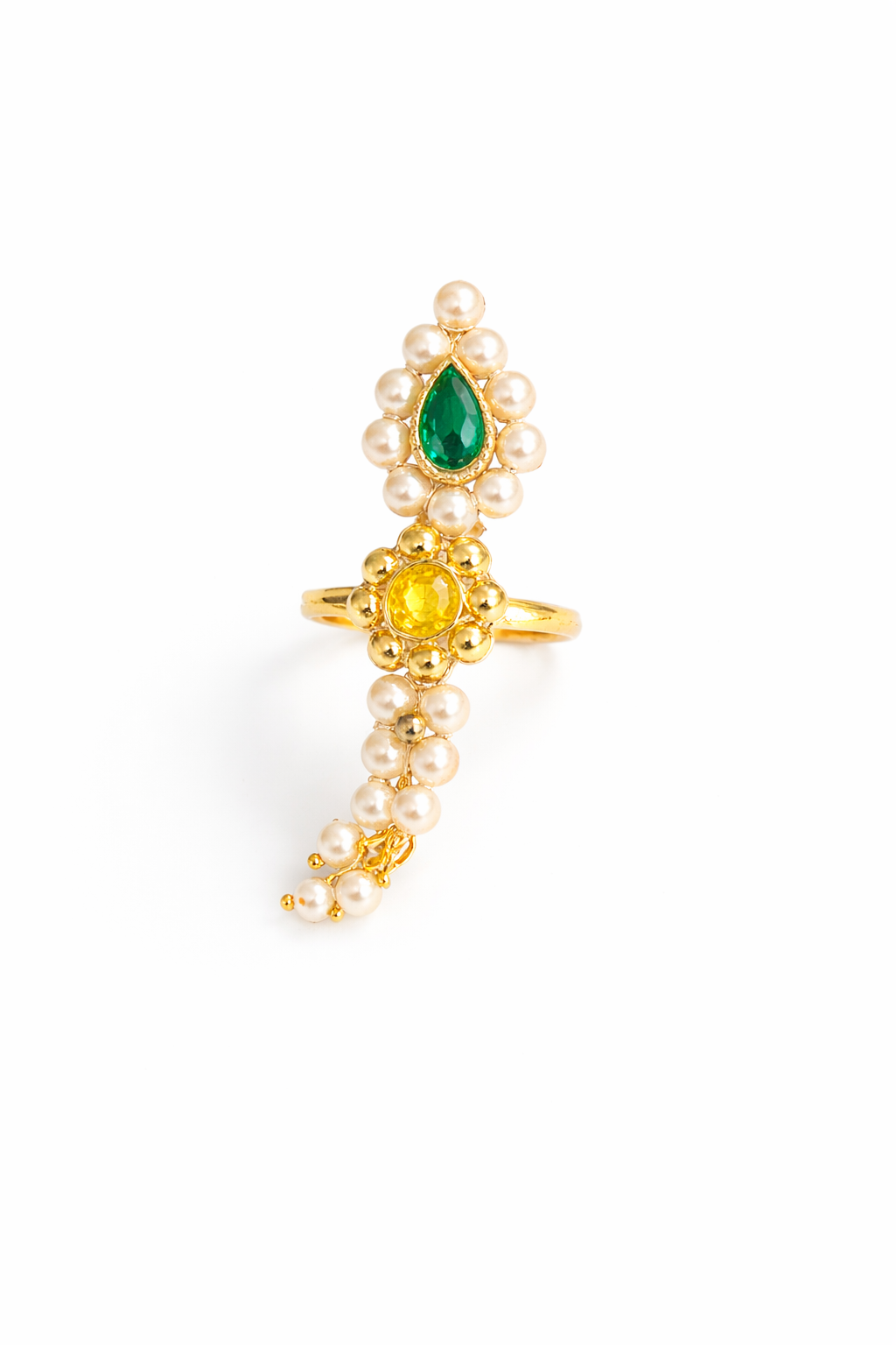 The teardrop green stone adds a regal touch, while the vibrant yellow centerpiece brings warmth and festivity. Finished with delicate pearl drops and a gold-toned base, this Nath finger ring is perfect for weddings, festive occasions, cultural events, and bridal looks. Lightweight yet statement-making, it complements lehengas, sarees, and ethnic ensembles effortlessly.