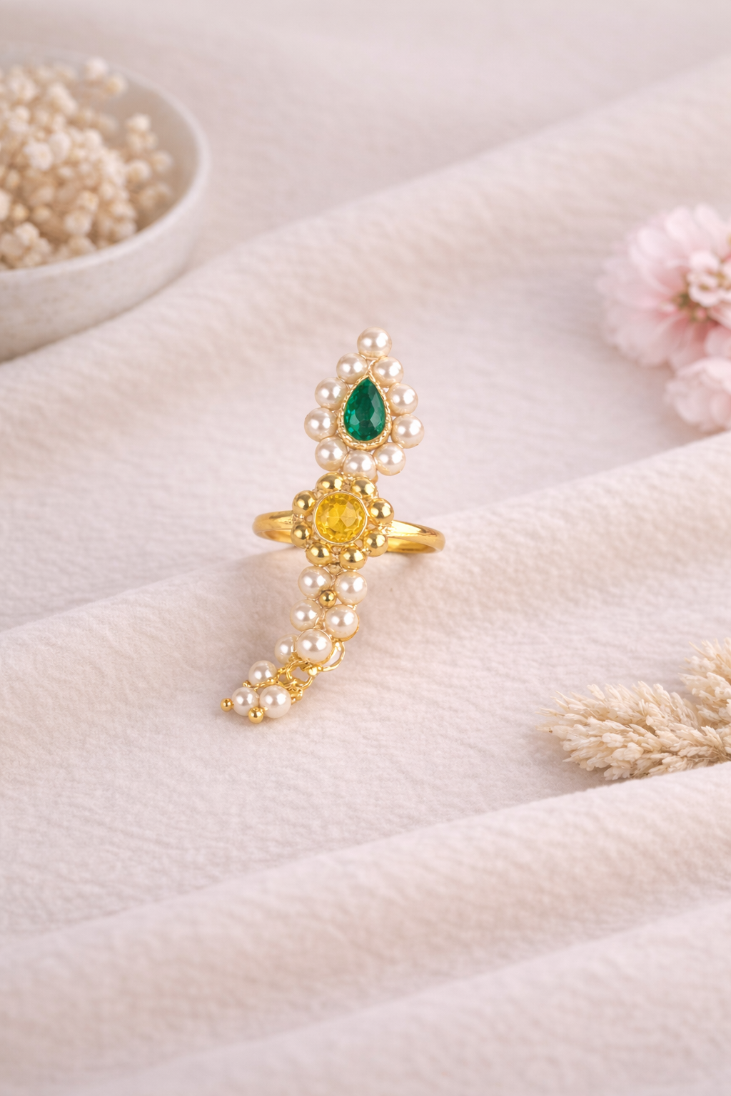 Celebrate timeless Indian elegance with this handcrafted Pearl Nath Finger Ring, beautifully adorned with luminous pearls and striking green and yellow stones. Designed in a traditional Nath-inspired silhouette, this finger ring blends classic craftsmanship with contemporary styling.